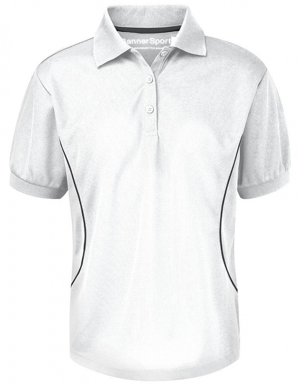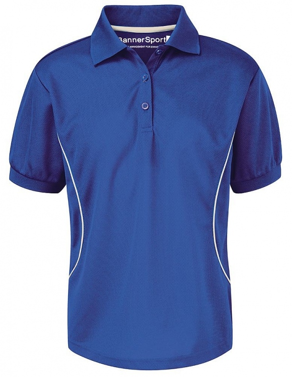 The school games polo shirt has contrasting colour piping along side panel seams. Curved hem style, girls / ladies button placket, flat knit collar and ribbed short sleeve cuffs.