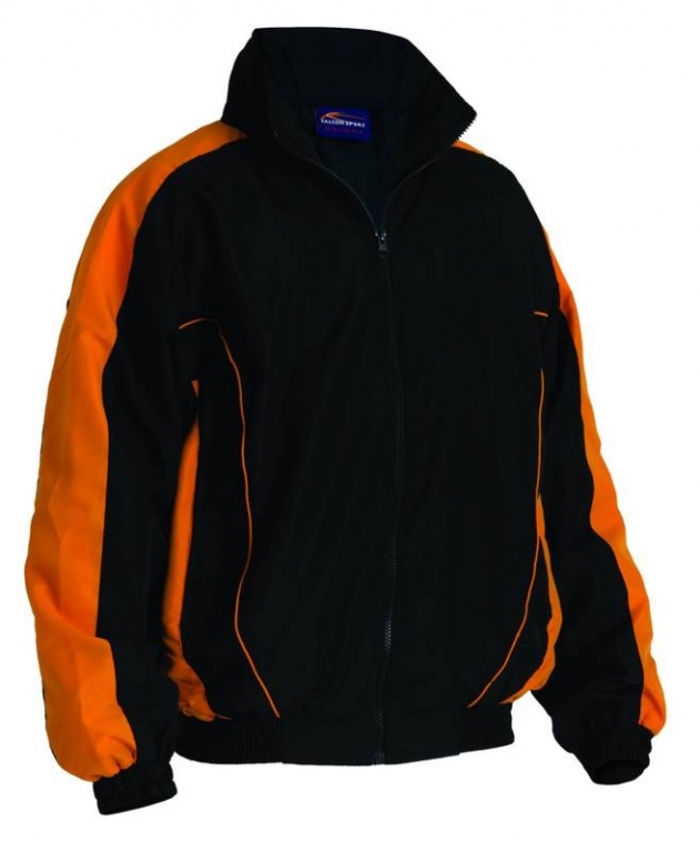 Sports training top jacket with 100% polyester outer and warm poly/cotton lining, turning to nylon at sleeves. Sports design with contrast panels, full zip front fastening, elasticated cuffs and 2 zip pockets.
