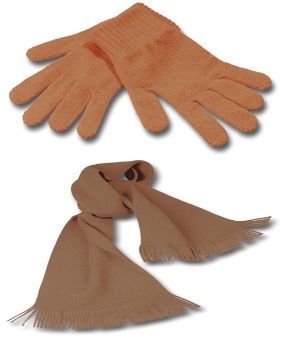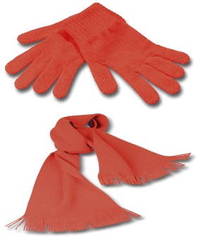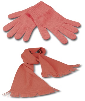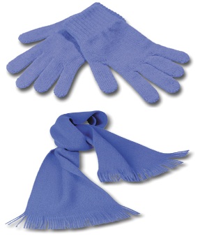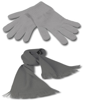 Set of knitted scarf and stretch gloves for extra warmth when travelling to and from school on cold days. Made of acrylic, the gloves have a ribbed cuff and the scarf is finished off with a fringe.