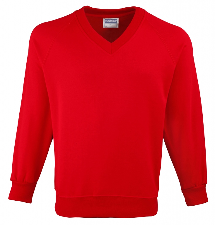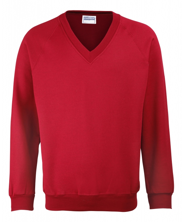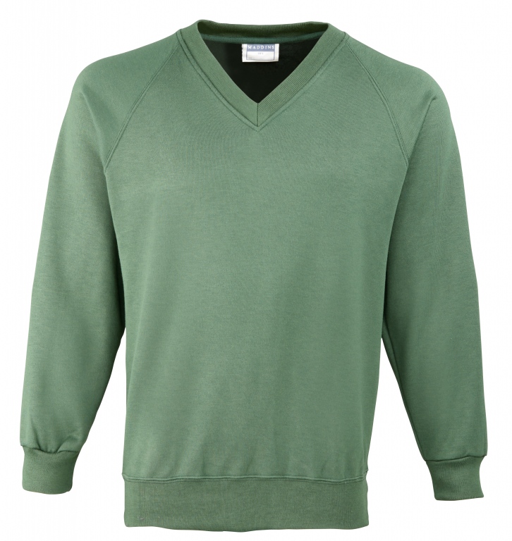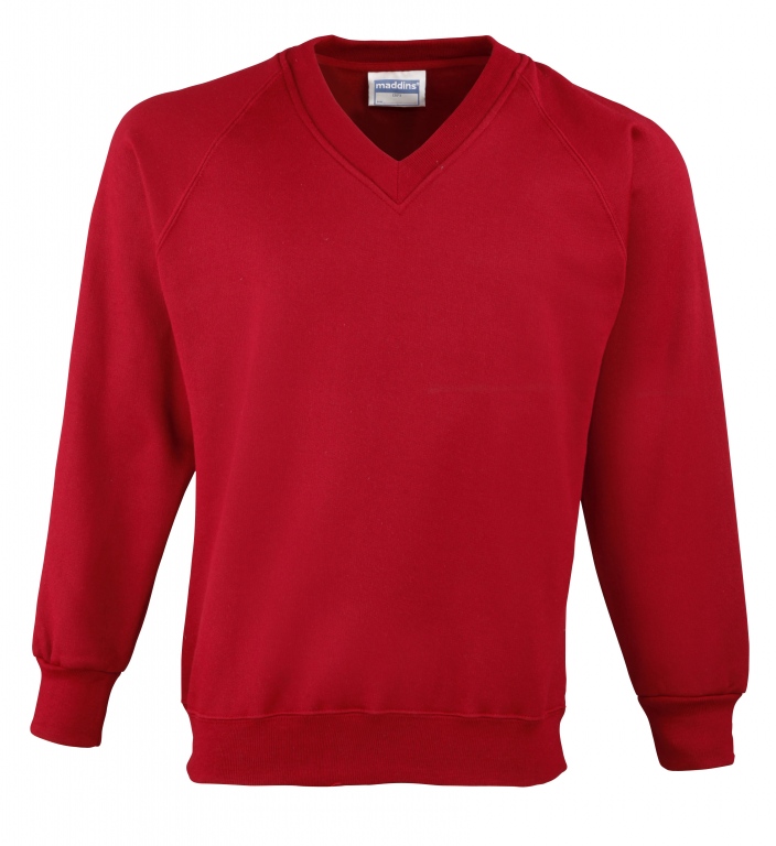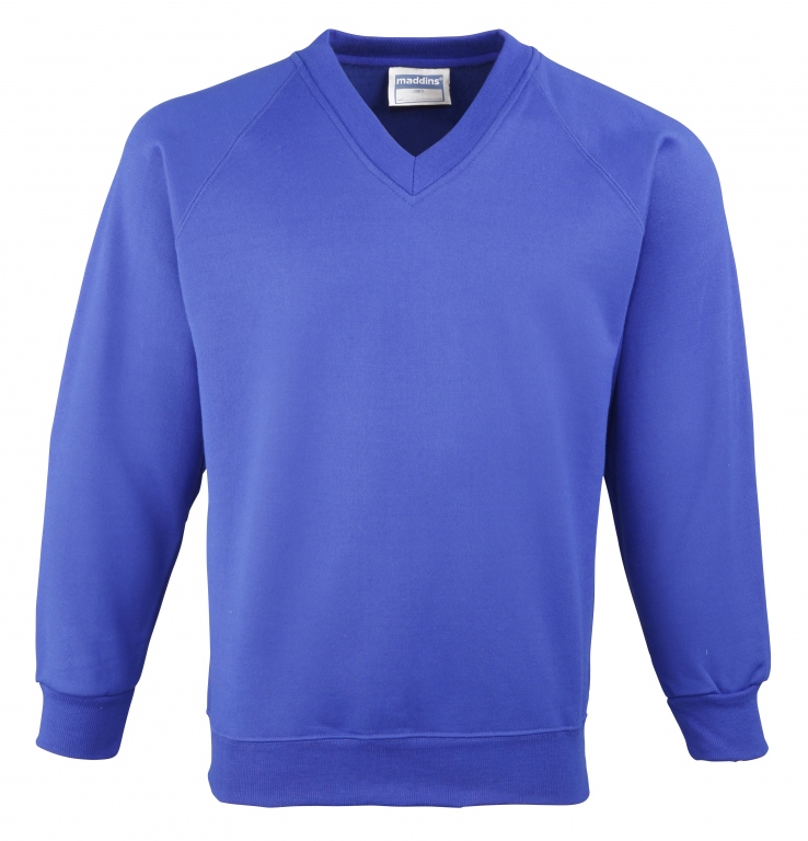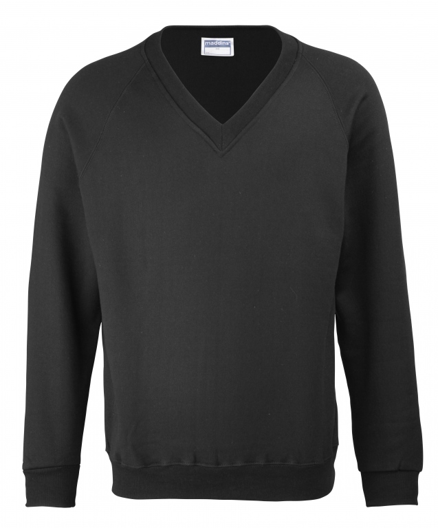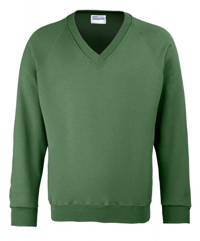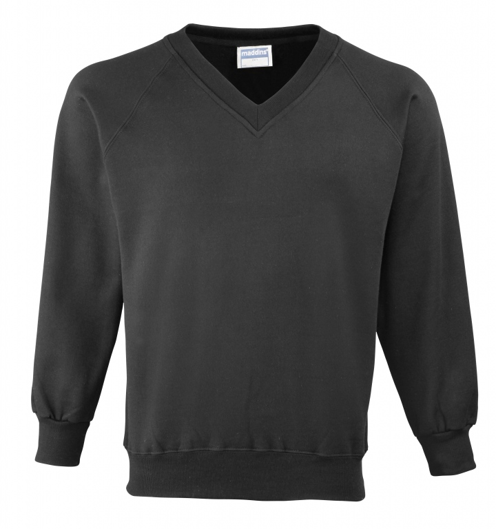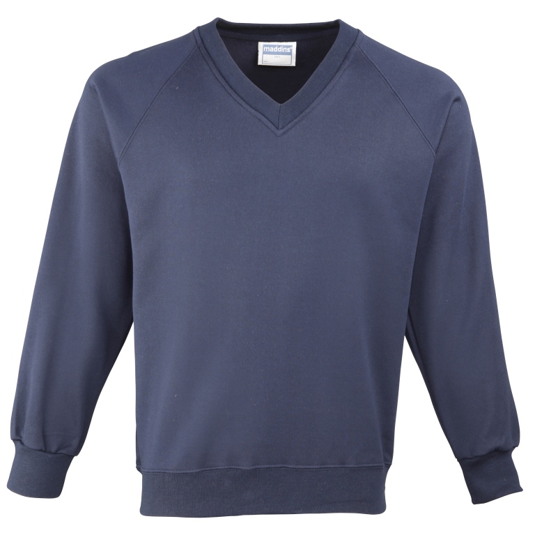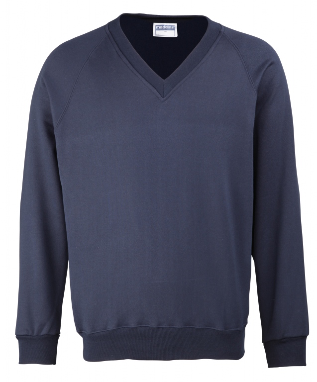 Eco school wear uniform v-neck sweatshirt colours: Navy Blue, Black, Bottle Green, Burgundy, Oxford Grey, Red, Royal Blue